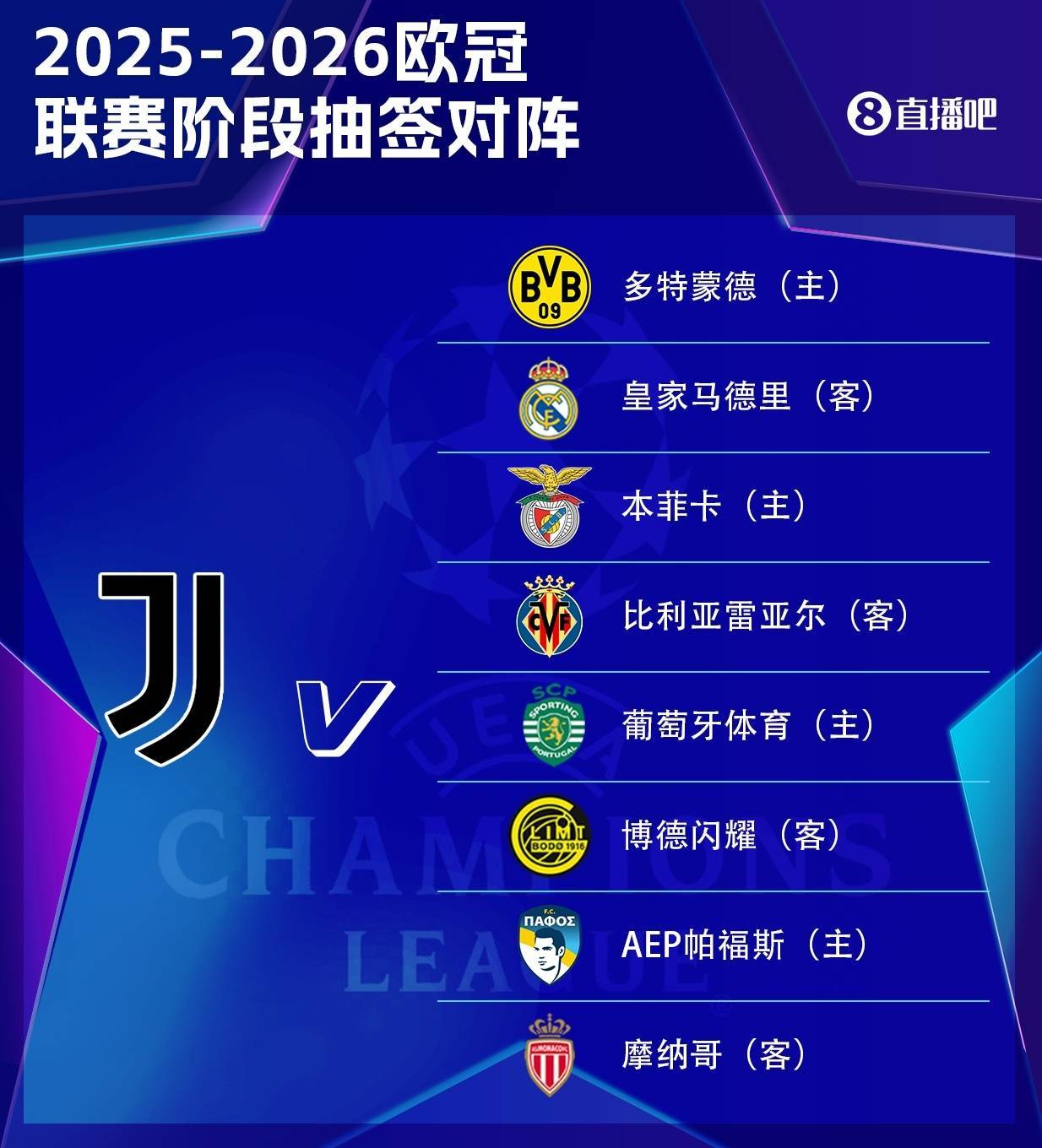 直播吧08月30日讯 欧足联官方公布欧冠联赛阶段赛程,尤文赛程如下。